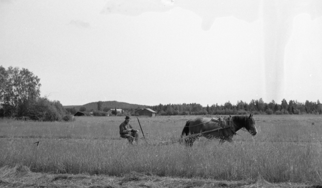Bildbeskrivning Slåtter på Skäret, söder om Antnäs. Brynolf Nyström på slåttermaskinen.